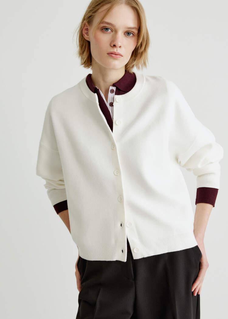 Где купить и сколько стоит: тонкий базовый лонгслив из шерсти и кашемира в 2Mood стоит 14 980 руб. — он подойдет как для кэжуал-комплектов, так и для сочетания с акцентными вещами. Кардиган с круглым вырезом и неконтрастными пуговицами есть в Sela за 2999 руб., а в Zarina на скидках можно найти трендовый джемпер с воротником-поло за 1349 руб.