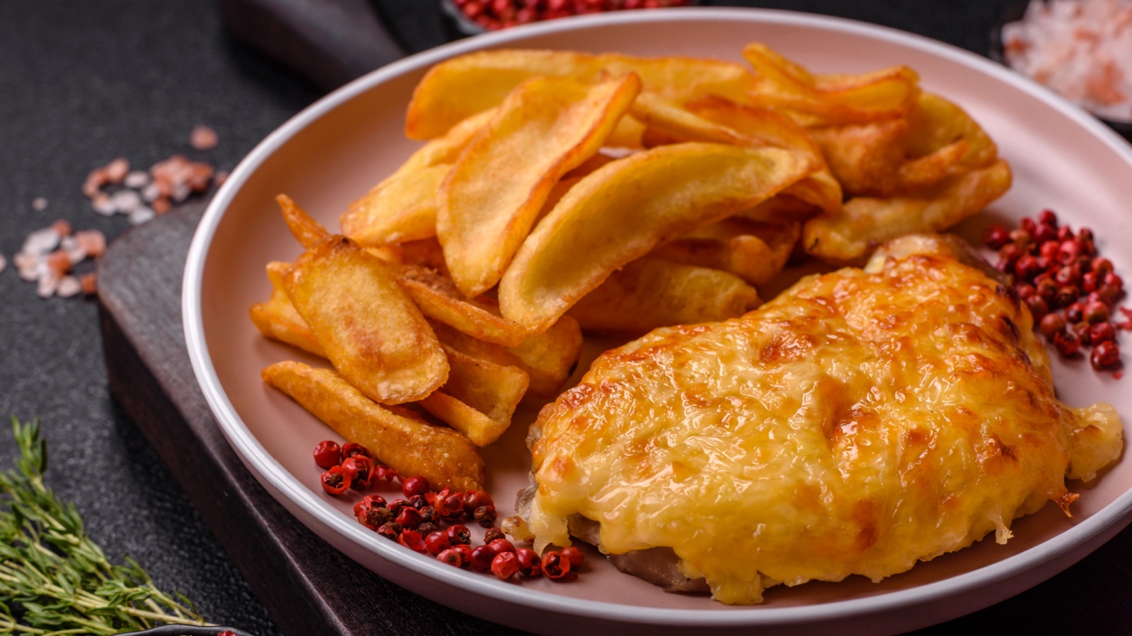Мясо по-французски — это популярное блюдо русской кухни, которое, несмотря на название, не имеет никакого отношения к Франции [1]. В его составе — простые и доступные ингредиенты. Если замариновать мясо заранее, то приготовление занимает около часа. В порции 200 г содержится примерно 350 ккал [2].