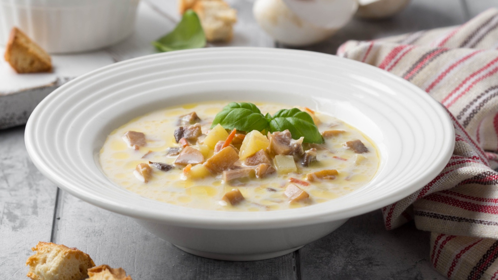 Суп с шампиньонами — это первое блюдо на основе овощного бульона, с добавлением грибов и плавленого сыра. Его отличают мягкая кремовая текстура и насыщенный аромат. В 200 г готового супа содержится примерно 120 ккал, время приготовления занимает около 30–40 минут [1].