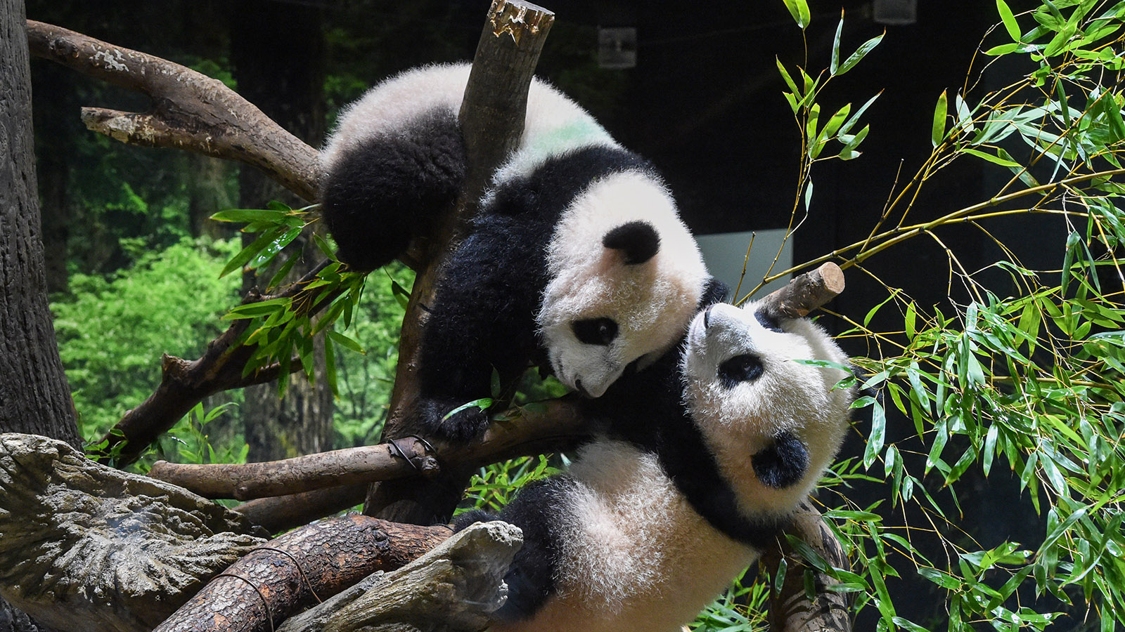 Панда Сяо-Сяо (справа) и панда Лей-Лей (слева), играющие в зоопарке Уэно в Токио, Япония в 2022 году