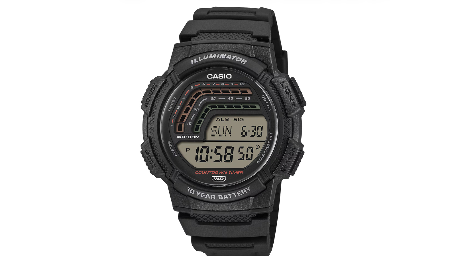 Casio WS1800 — часы с акцентом на функциональность и автономность. Фронтальная часть защищена сферическим минеральным стеклом из смолы, заявлена водонепроницаемость устройства при погружении на глубину до 100 м.