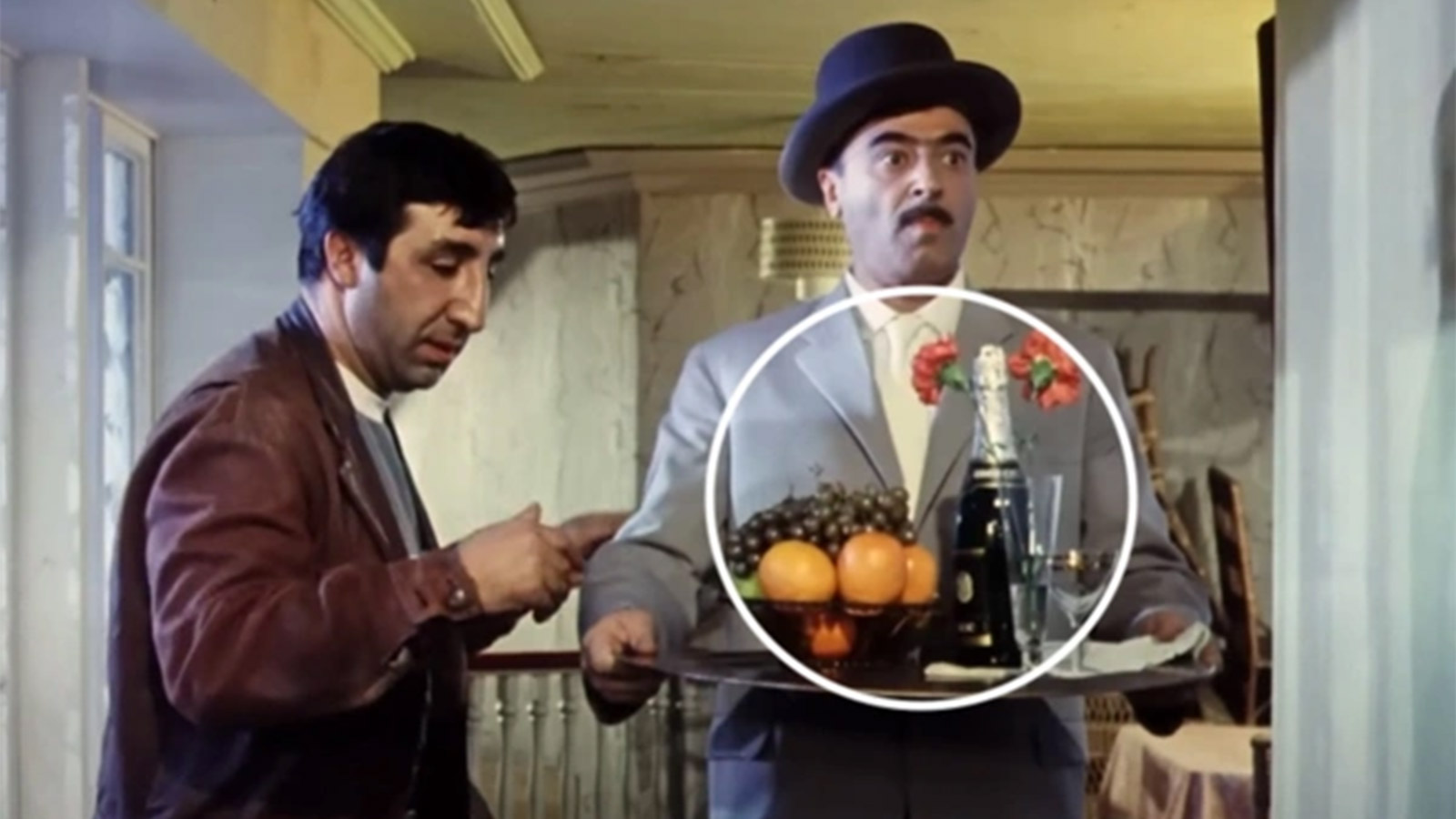 Товарищ Саахов заходит с подносом, на котором стоит бутылка шампанского. Кадр из фильма «Кавказская пленница, или Новые приключения Шурика»