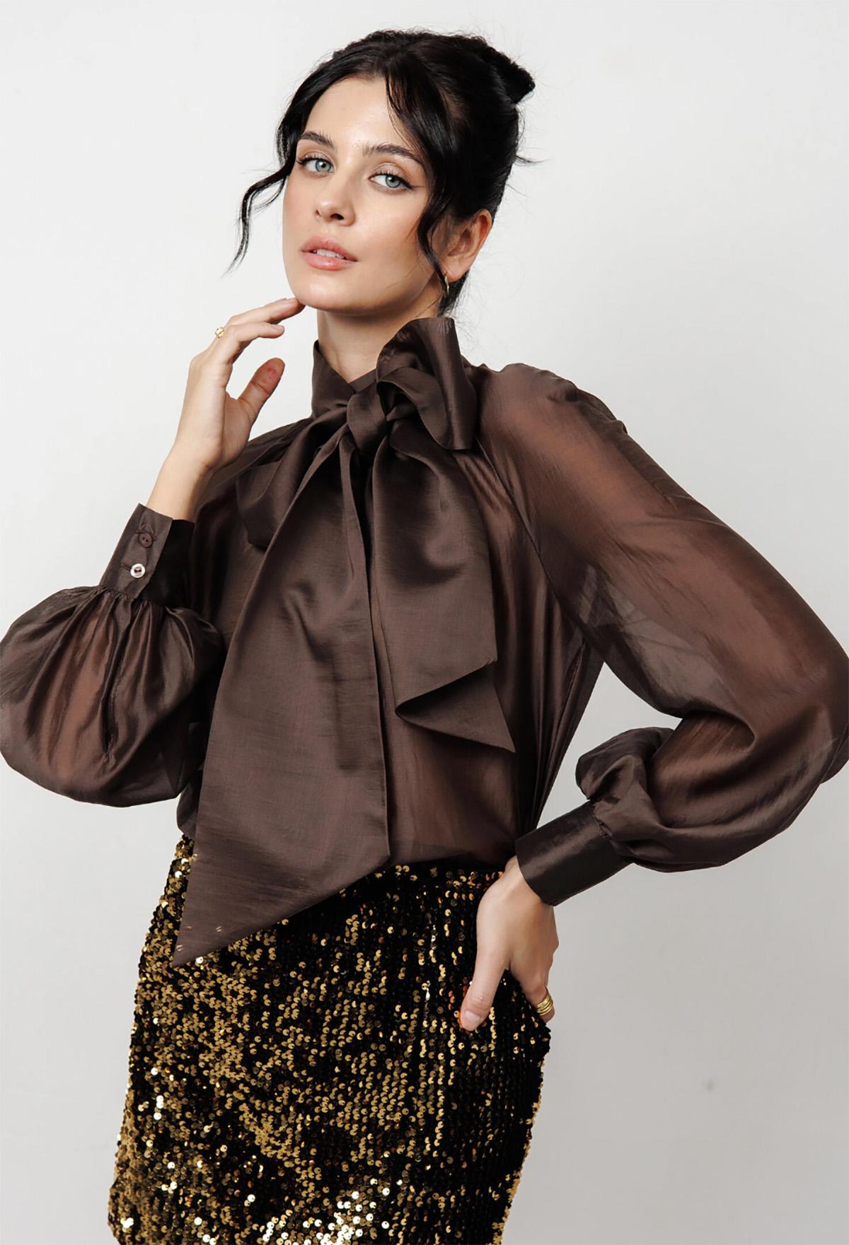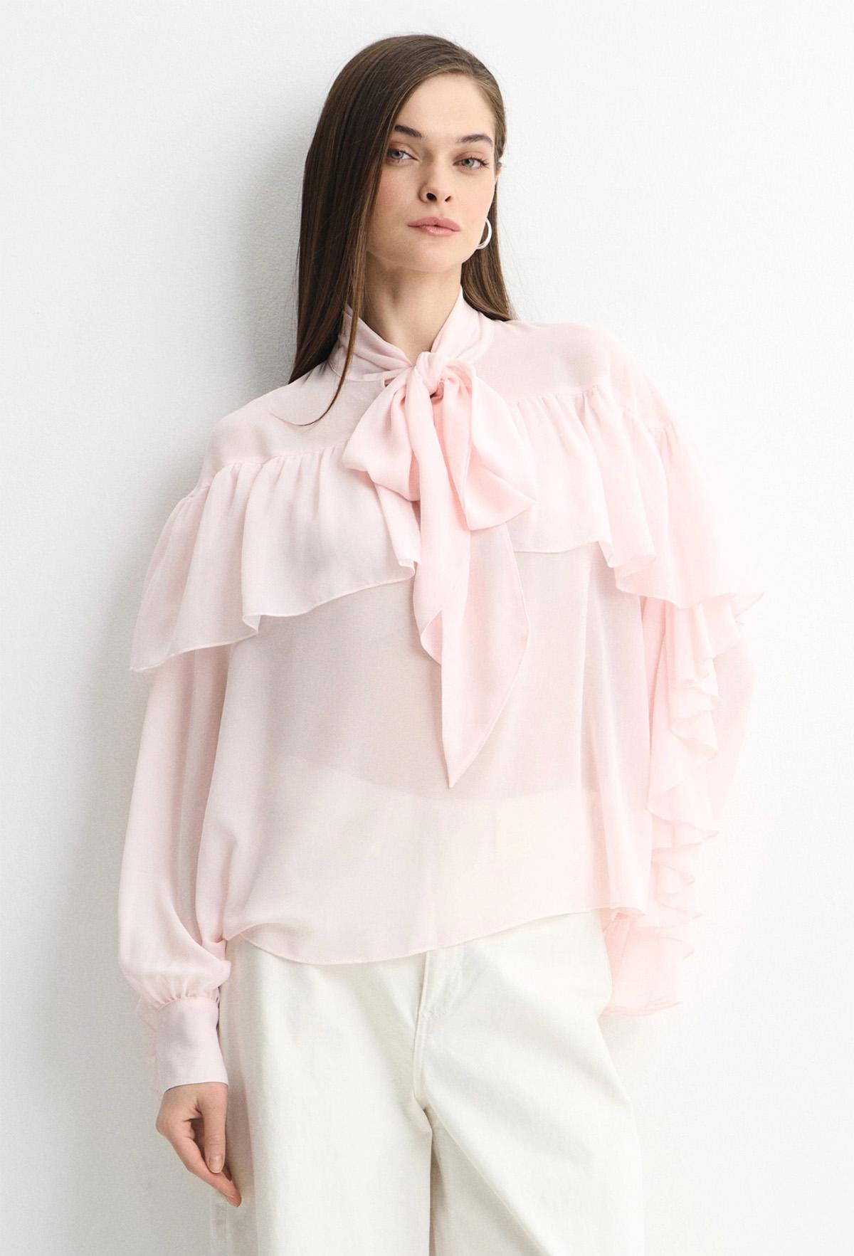 Актуальны и блузы с бантом — вариант из тенселя с полупрозрачными рукавами-буфами есть в Annen за 2670 руб., а нежная шифоновая модель от O'stin стоит 4599 руб.
