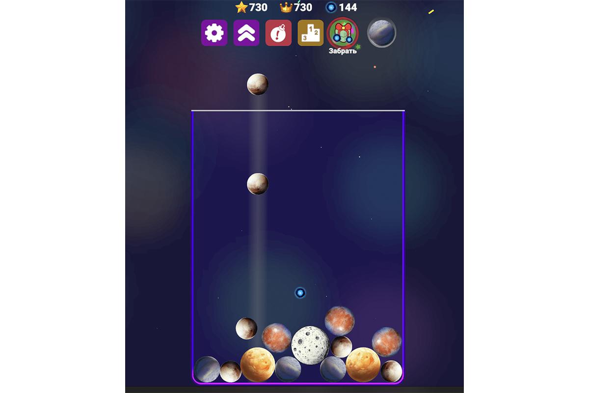 В этом проекте геймерам предстоит соединять планеты, получая все более крупные небесные тела. В игровую зону, как в «Тетрисе», сверху сбрасываются планеты. Две одинаковые — объединяются в одну более крупную. Игроку нужно размещать планеты как можно более удачно и экономно. Главная задача набрать максимальное количество очков. В игре также присутствует таблица лидеров. Найти проект можно с помощью поиска по названию: «Соединяй планеты».