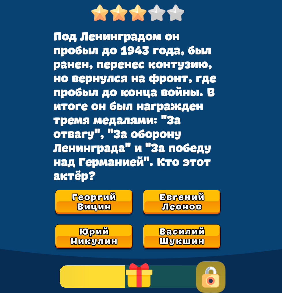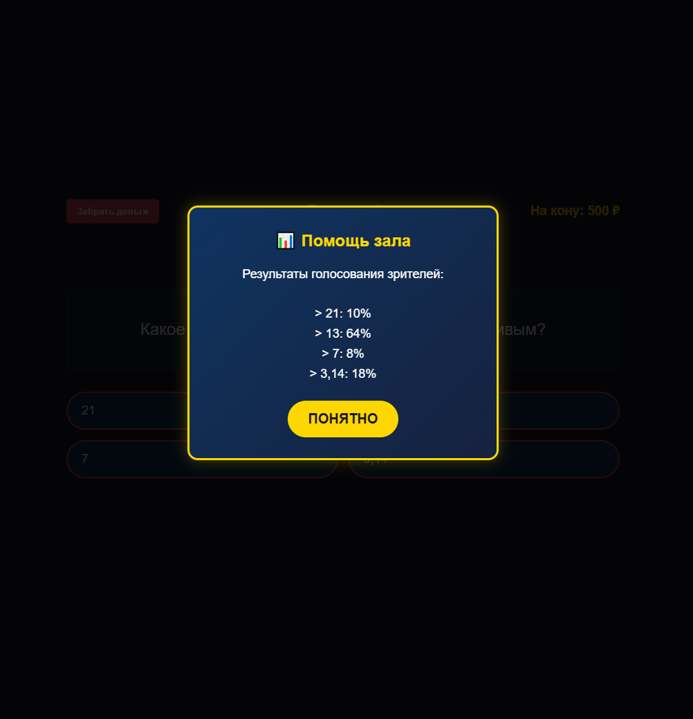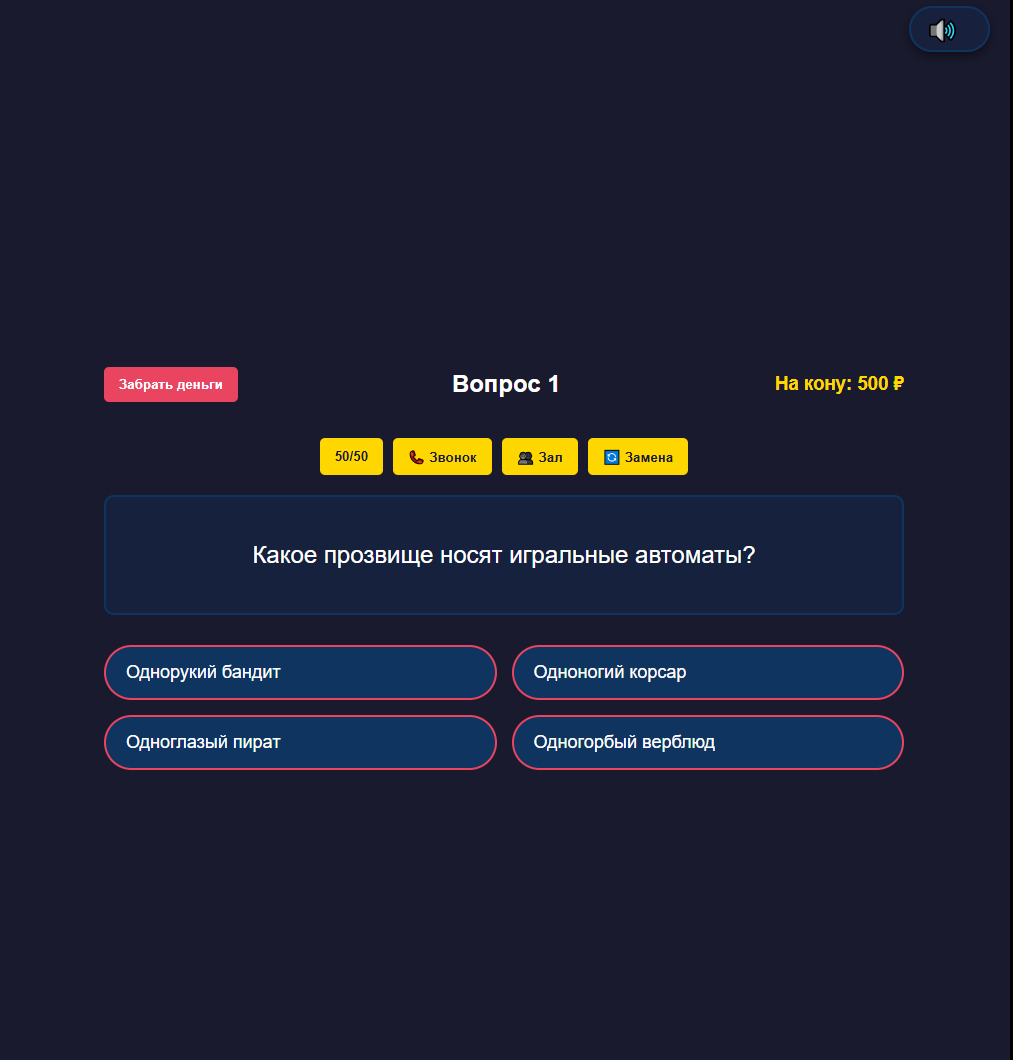 Проект является аналогом известной телеигры «Кто хочет стать миллионером». В каждом раунде необходимо ответить на 15 вопросов. Каждый раз у игроков есть четыре варианта ответа. Есть несгораемые суммы, в случае неправильного ответа, на счет игрока запишется количество очков равное последней такой сумме.