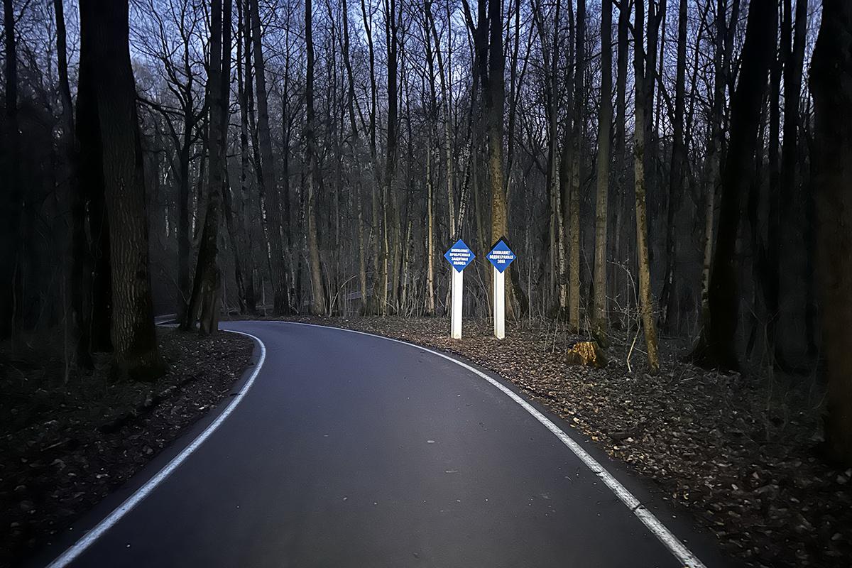 Важное напоминание: в лесу могут быть перебои с мобильной связью. Примерно со второй трети трассы начались проблемы с интернетом, а голосовой помощник несколько раз мне сообщал, что я ушла с маршрута или же что маршрут перестроен, в моменты, когда я просто двигалась вперед. Через какое-то время связь пропала окончательно, а в парке воцарились сумерки. В этот момент я пожалела, что не взяла с собой походный фонарь. Спасала встроенная в велосипед подсветка, потому что второй минус — на протяжении практически всей лесопарковой части маршрута я не увидела ни одного фонаря. Людей было немного, путь они освещали телефонами, велосипедисты тоже встречались.
